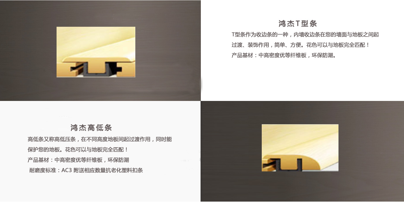 專業(yè)生產(chǎn)各類地板輔料。本廠成立于2008年,經(jīng)過嚴(yán)格的質(zhì)量控制,已開發(fā)出SPC、WPC、層壓板三種不同的壓花材料。每一種材料都有超過7種不同的過渡型材,如t型線、減速器、端蓋、四分之一圓、樓梯前鼻、樓梯板、踢腳板等。